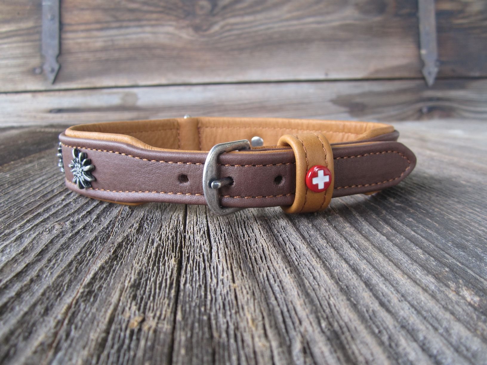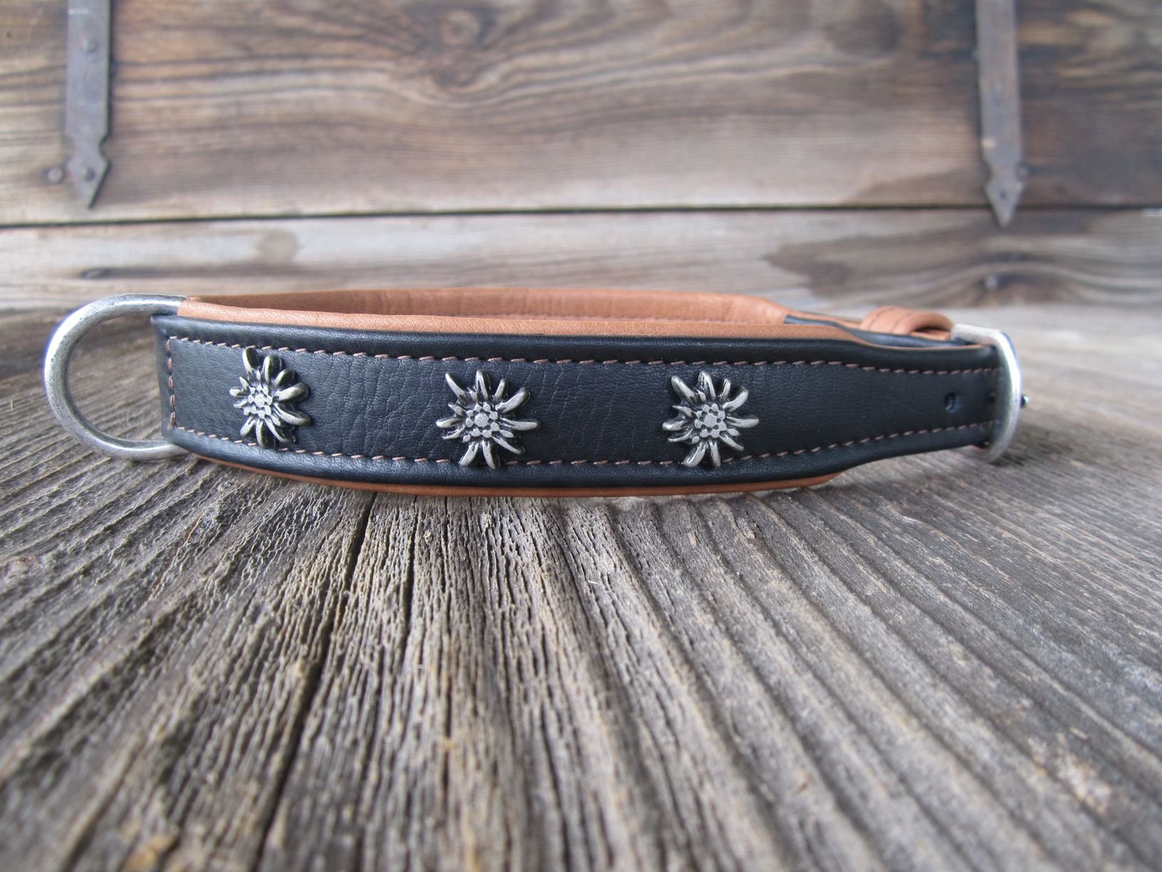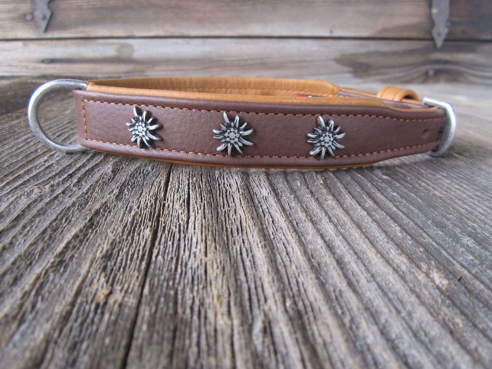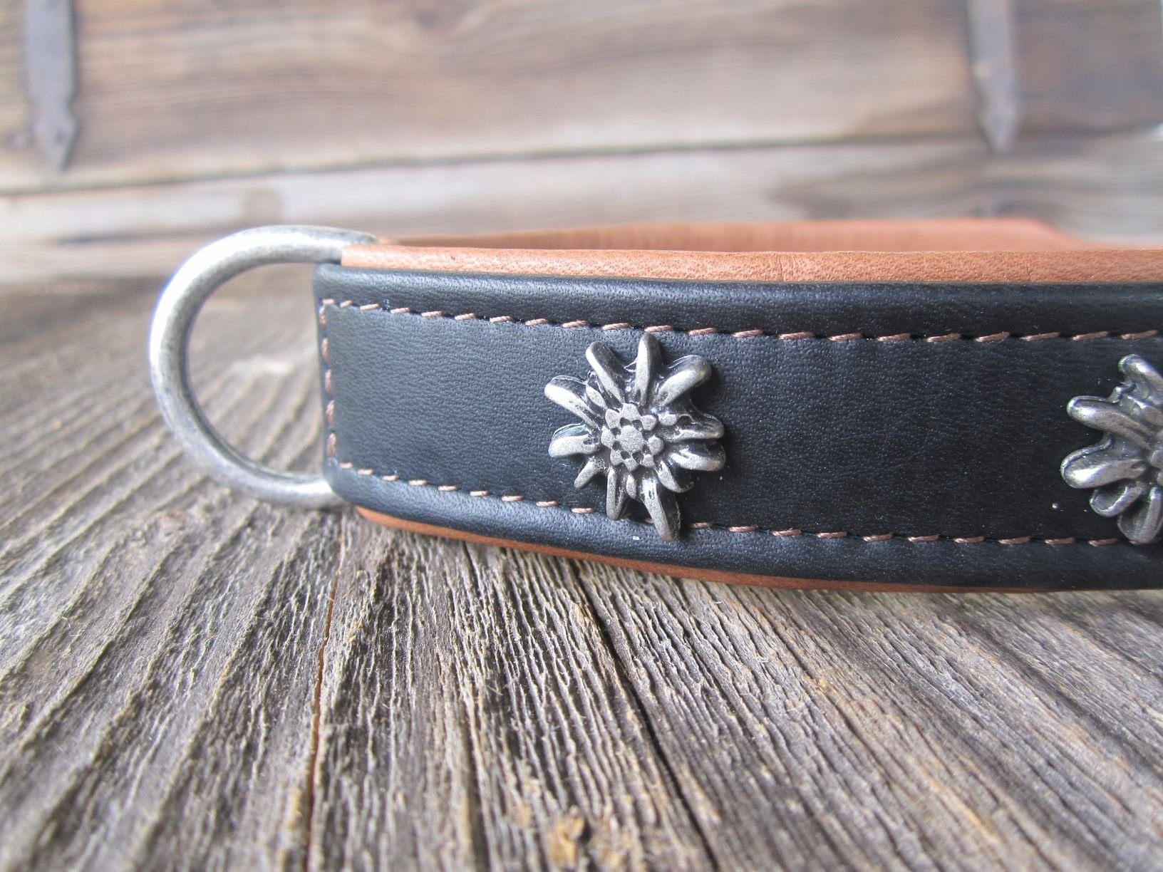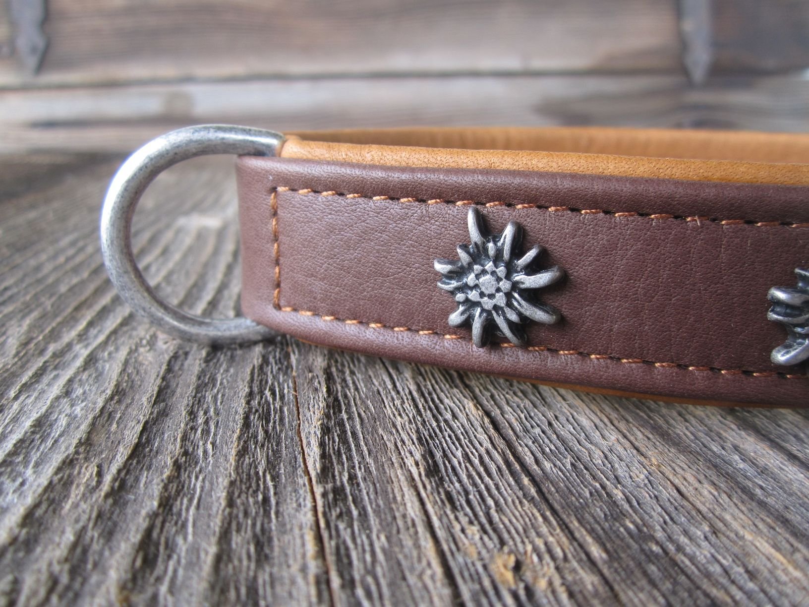 Material: Einheimisches Bio-Rindsleder, rein vegetabil gegerbt und natürlich eingefettet. Nickelfreie Ringe und Haken aus solidem Messing mit Überzug aus echtem Altsilber. Edelweissnieten mit altsilber Überzug