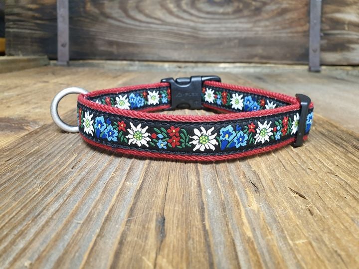 Farbe: Band rot, Webborte schwarz mit Alpenblumen Motiv