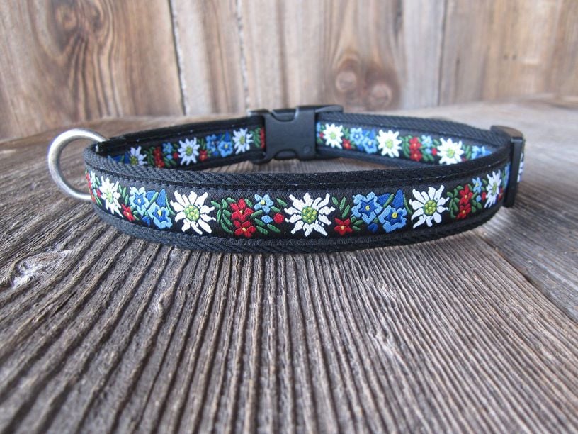 Farbe: Band schwarz, Webborte schwarz mit Alpenblumen Motiv